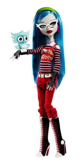 Познакомьтесь с ученицей старших классов Школы монстров Гоулией Йелпс - дочь Зомби. У нее есть шикарные очки, которые подходят к любому наряду. Ходит она очень медленно и разговаривает только на языке зомби. В комплект с куклой входят ее любимое животное - филин Сэр Ух-ух-лот, сумочка в виде аудиокассеты, дневник на русском и румынском языках, в котором можно прочитать ее самые сокровенные страхи и мысли, расческа для волос и подставка для куклы.