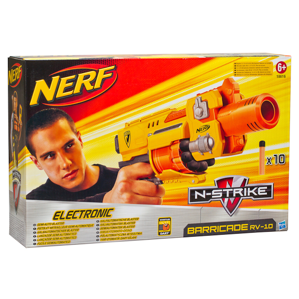 NERF Barricade — полуавтоматический моторизованный скорострельный бластер. Компактный дизайн и барабан револьверного типа, рассчитанный на 10 стрел. Бластер «Баррикад» можно усовершенствовать с помощью дополнительного оборудования (приобретается отдельно): приклады, прицельная планка, световой целеуказатель. В набор входит бластер и 10 свистящих стрел. Для работы бластера NERF Barricade необходимы 3 батарейки AA (в комплект не входят). Детям от: 6 лет до: 12 лет
